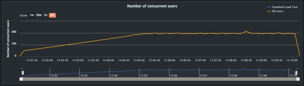 ในช่วงพีคของการทดสอบ มีผู้ใช้งานจำลองพร้อมกันสูงสุดประมาณ 200 คน ระบบสามารถรองรับผู้ใช้งานพร้อมกัน 200 คนได้, ไม่มีอาการ Response Time พุ่งผิดปกติ, ไม่มี Error เกิดขึ้นแม้โหลดสูงสุด ถือว่าเหมาะกับระบบระดับองค์กรขนาดกลาง
