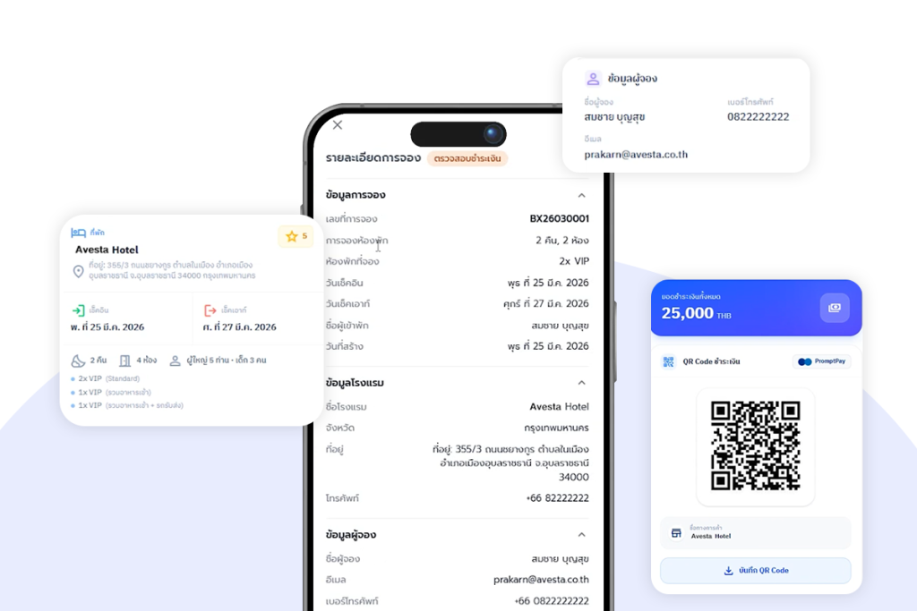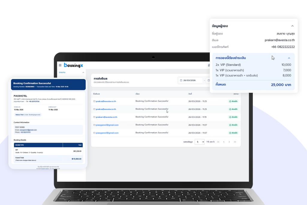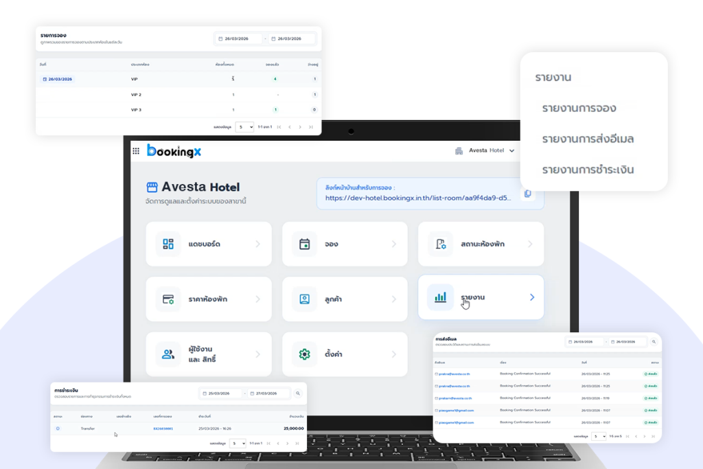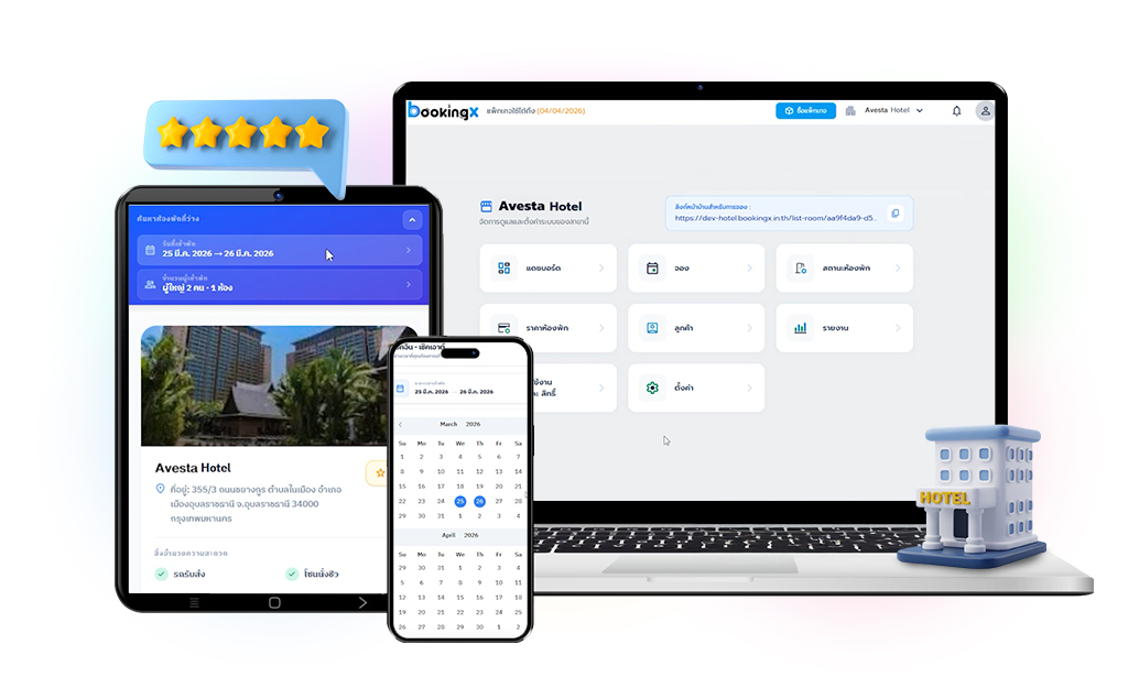 BookingX Hotel คือแพลตฟอร์มบริหารจัดการระบบจองโรงแรมออนไลน์ ครบ จบในระบบเดียวที่ออกแบบมาสำหรับธุรกิจที่พักทุกประเภท ไม่ว่าจะเป็น โรงแรม โฮสเทล รีสอร์ท บ้านพัก หรือบูทีกโฮเทล ช่วยให้คุณสามารถเปิดรับการจองได้ด้วยตัวเองผ่านระบบของคุณ (Private Branding) โดยไม่ต้องพึ่งพาแพลตฟอร์มคนกลาง รองรับการชำระเงินออนไลน์สามารถเชื่อมต่อกับ payment gateway การจัดการห้องพักแบบเรียลไทม์ และระบบหลังบ้านที่ใช้งานง่าย ครบ จบในระบบเดียว ที่จะช่วยให้ลูกค้าสามารถจองห้องพักผ่านออนไลน์ได้ตลอด 24 ชั่วโมง พร้อมแสดงห้องว่าง ราคา และรายละเอียดต่าง ๆ แบบเรียลไทม์ในขณะเดียวกัน ผู้ประกอบการสามารถบริหารจัดการการจอง ห้องพัก และรายได้ ผ่านระบบหลังบ้านได้อย่างมีประสิทธิภาพ